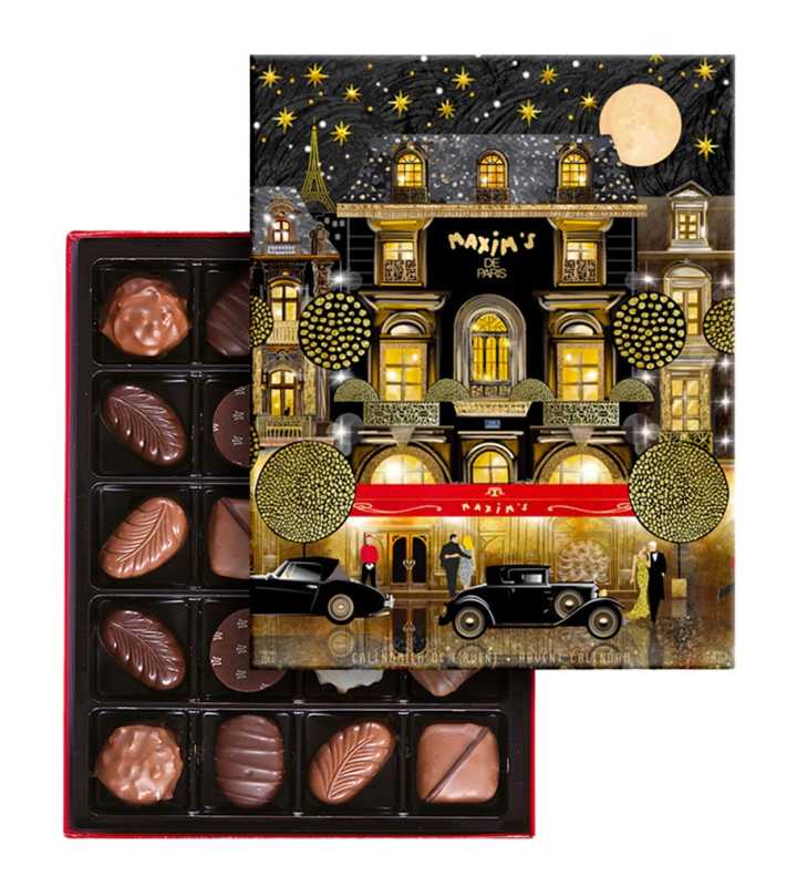 A square tin decorated with the menu of Maxim’s restaurant revealing a savoury collection of dark, milk and white chocolate rochers.