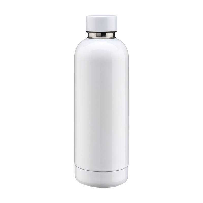 NOVINKA 2025. 500 ml capacity thermal bottle, made in stainless steel with double wall and specially designed for sublimation printing. Gloss white finish with matching screw cap, BPA free. Presented in an individual box with kraft design.Instruction manual available in Spanish and English.
