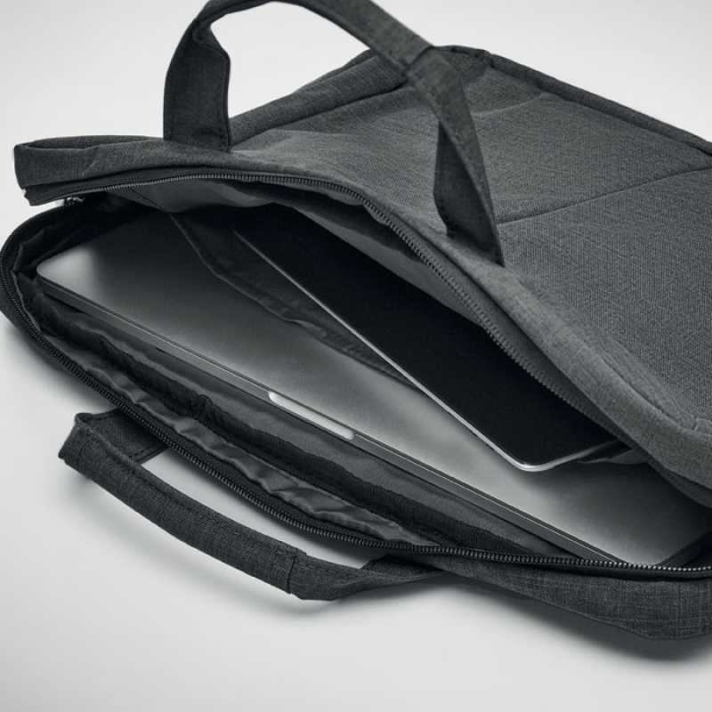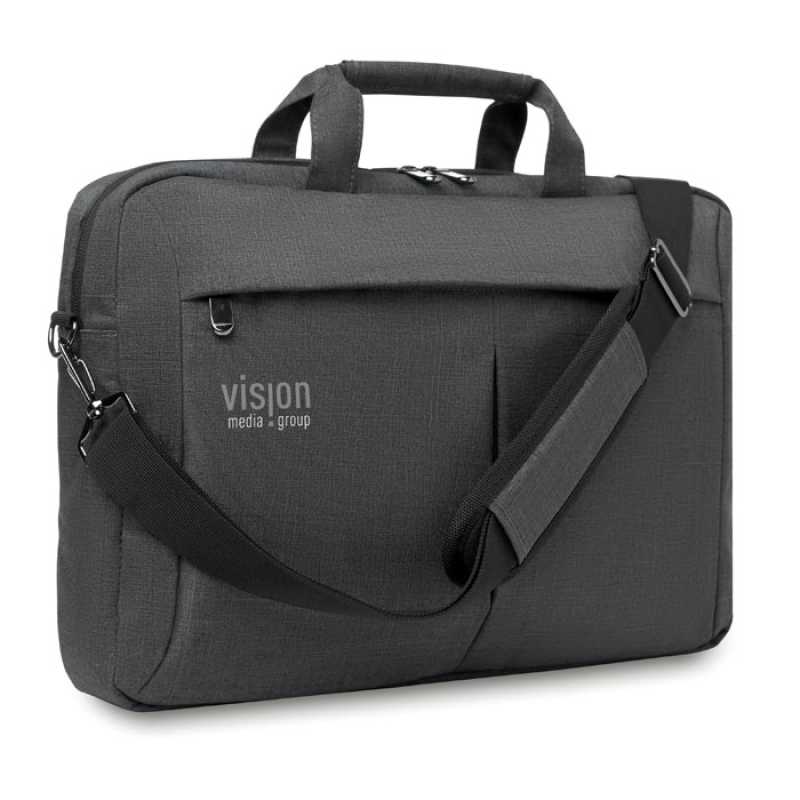 Taška na notebook z dvoubarevného polyesteru. Hlavní kapsa na 15 palcový notebook, přední kapsa na zip. Odnímatelný nastavitelný popruh přes rameno. Úchytka na vozík.