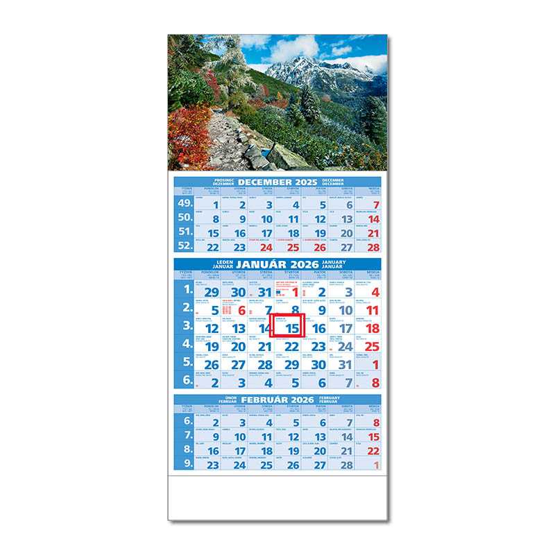 Plánovací 3-mesačný modrý kalendár s priloženou hornou čistou lištou, s menami v SK + CZ, názvy mesiacov a dní v SK, CZ, UK, DE a HU. . Možnosť výberu obrázku. Obrázok H Priestor na potlač: 29,5 x 18,3 cm / 29,5 x 6 cm. Kalendárium: SK/CZ. Rozsah: 12 listov. Formát: 29,5 x 66,3 cm.
