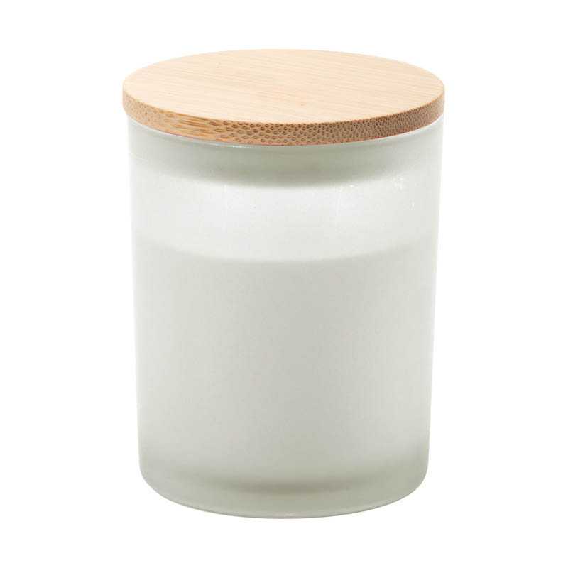 Vosková sviečka na rastlinnej báze v matnom sklenenom držiaku s bambusovým viečkom. S 200 gramami vosku. V kraftovej papierovej krabici.