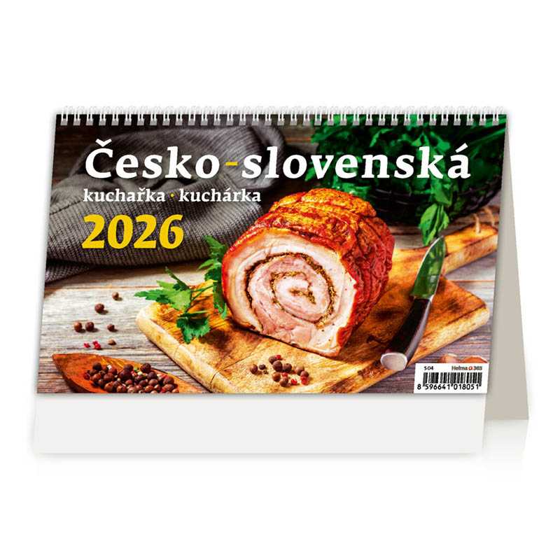 Stolový kalendár Česko-slovenská kuchárka 2026. Formát kalendára: 22,6 x 13,9 cm. Kalendárium: české/slovenské týždenné riadkové. Počet strán kalendára: 58 + 2. Stojanček: so zámkom. Priestor na potlač: 22,6 x 3 cm. Česko-slovenské recepty a kalendárium