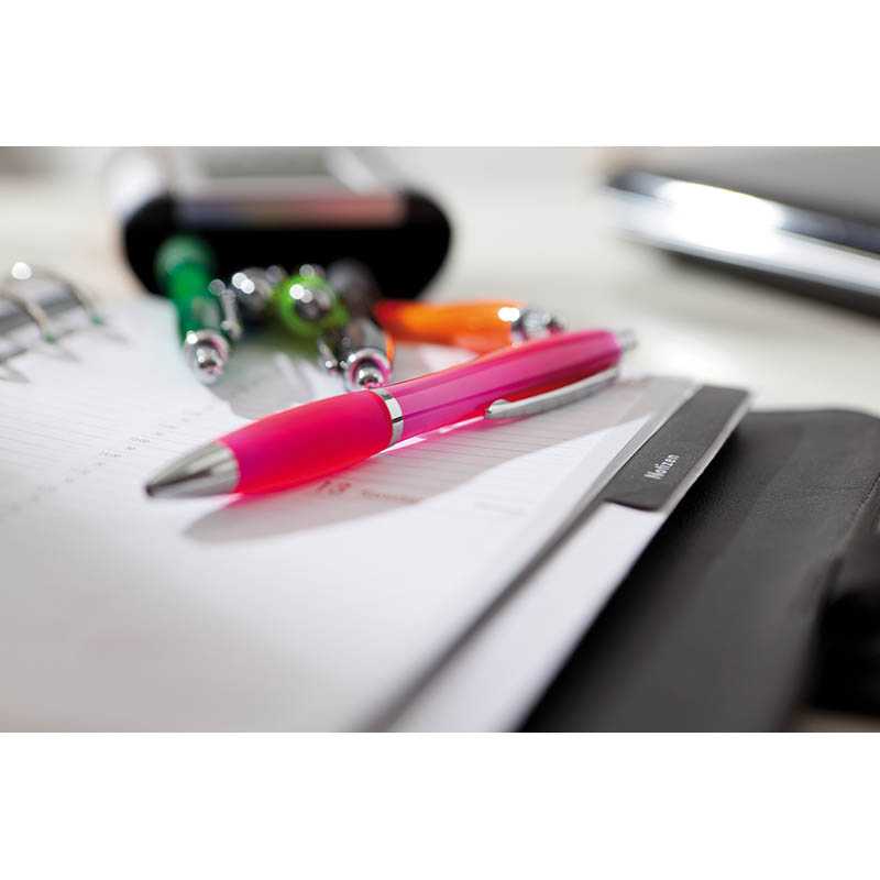 Plastové farebné guľôčkové pero. Dodáva sa s modrou náplňou.