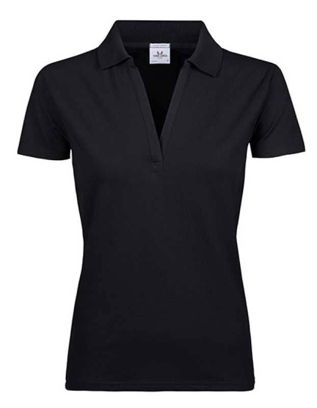 Ladies' polo pique in stretch quality made of organic Fairtrade cotton with elements of elastan for a better fit. Shaped v-neckline, ribbed collar and cuff, straight sleeve and stitch