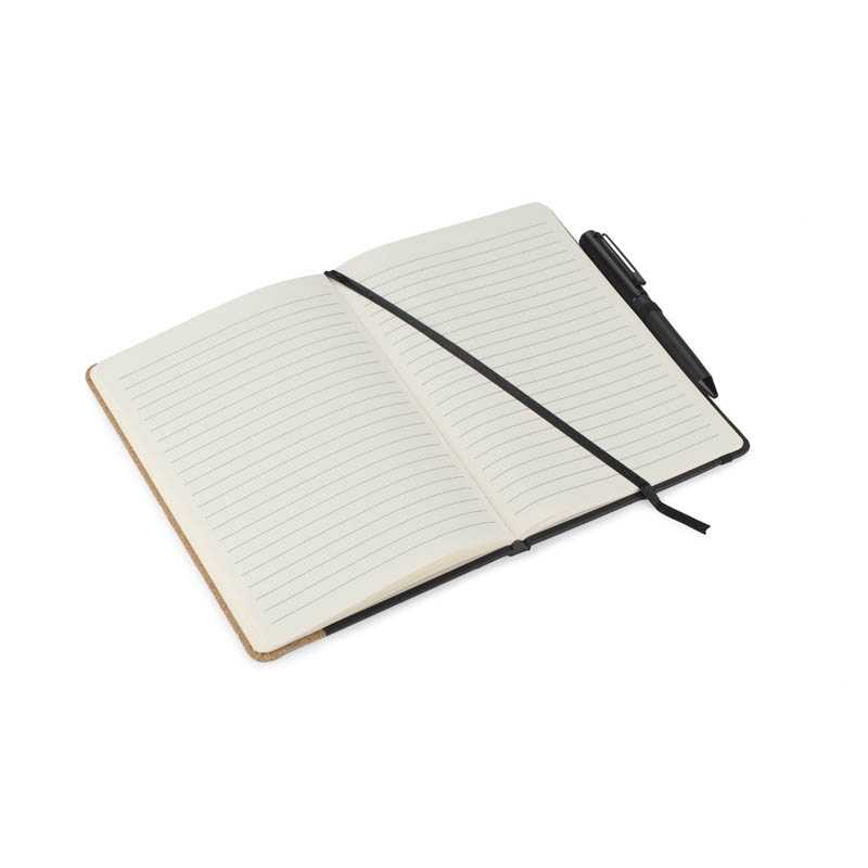 Zápisník 2 v 1. Zápisník A5 s integrovanou bezdrátovou 15W nabíječkou. S bavlněnými a korkovými detaily na obálce, 128 linkovaných stránek (64 listů). Záložka ze stuhy.