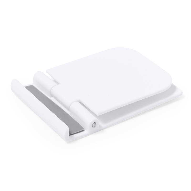 NOVINKA 2025. Smartphone and tablet holder made of resistant ABS. Compact and foldable design to take it anywhere. With different angle positions and support pads. Presented in an individual recycled bag.
