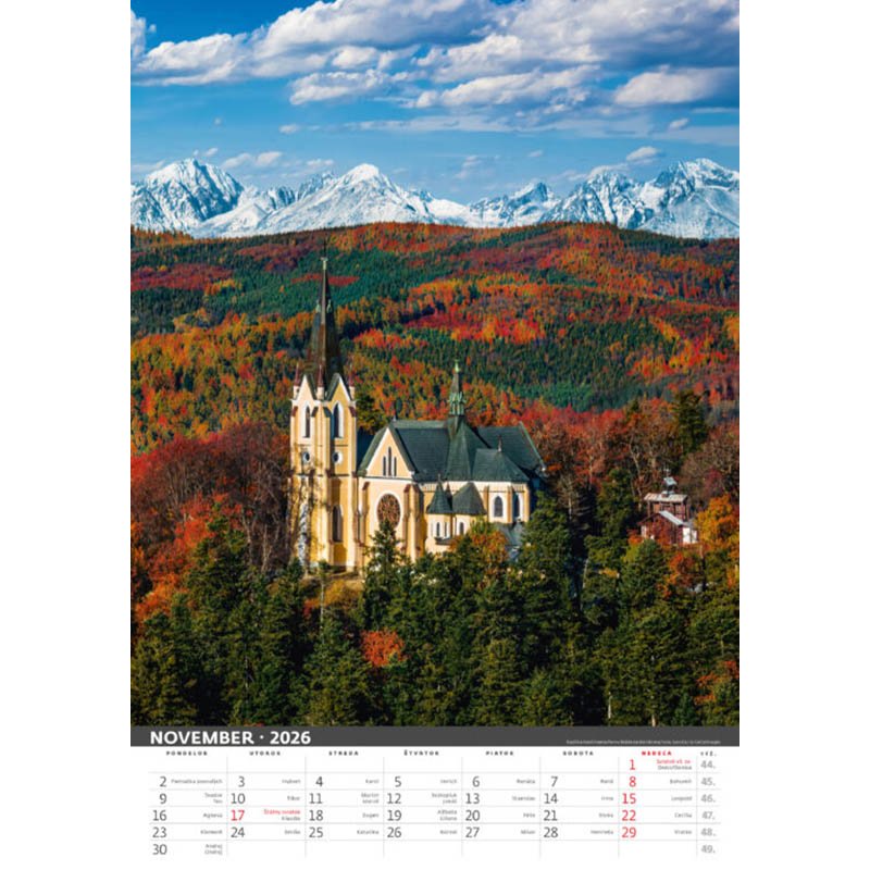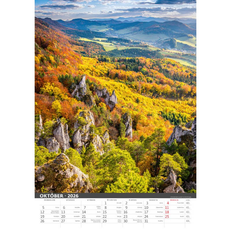 Kalendár Slovenská krajina 2026. Formát kalendára: 31,5 x 45 cm . Kalendárium: slovenské trojmesačné menné . Rozsah kalendára: 14 listov . Twinová väzba . Priestor na potlač: 31,5 x 7 cm
