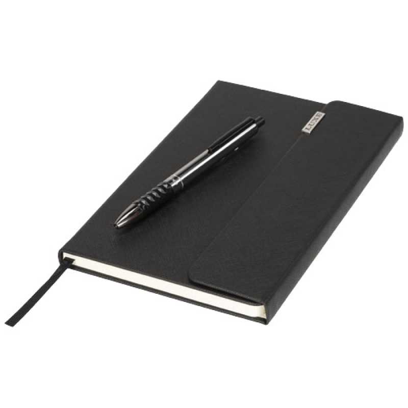 Darčekový set s keramickým hrnčekom, guľôčkovým perom a zápisníkom. Keramický hrnček s objemom 480 ml s matným čiernym povrchom a kovovým plieškom vo farbe gun metal; len ručné umývanie. Zápisník s pevnými doskami, 80 štvorčekových strán (70 g/m2), kovový