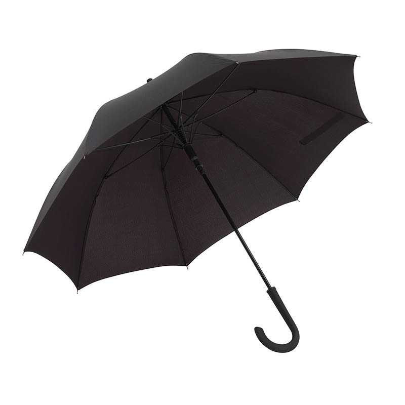 Convenient automatic function for quick opening, Windproof system for higher flexibility and stability in windy conditions, flexible fibreglass ribs, dull black plastic crook handle, higher corrosion protection due to galvanized steel shaft. Also available as golf umbrella (art. 2359).