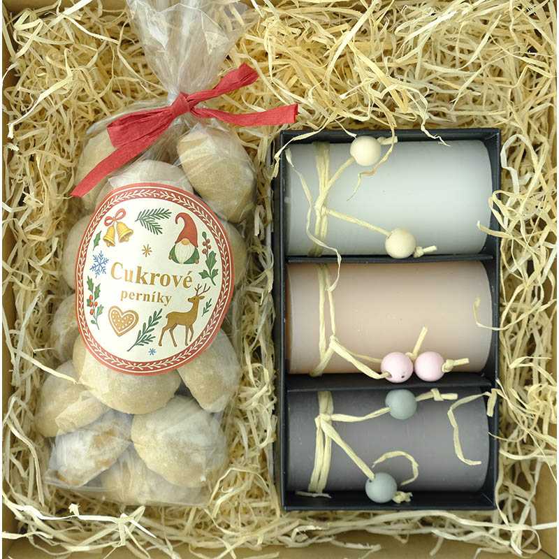 Darčeková krabica > prírodná / prírodná > 21x21x10 cm, Perníky cukrové 150g, Set vonných sviečok > viacfarebná