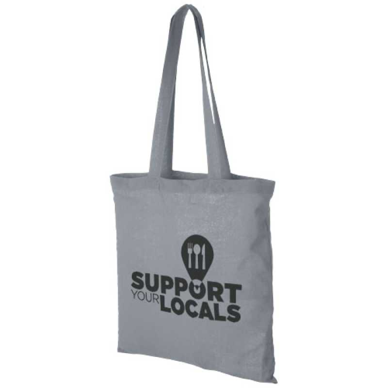 NOVINKA 2025. Bag in recycled cotton material 120 g/m2. Long handles of 70cm with reinforced and stitched finish. Recycled cotton label and resistance up to 8 kg in weight. Available in a wide range of eco colours, combined with a natural base.