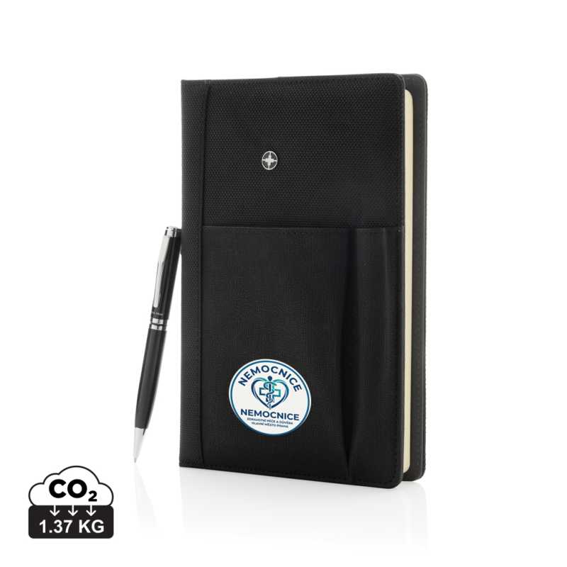 Výkonný polyesterový obal na zápisník 1680D a 600D s perom. Vrátane vyberateľného zápisníka s 192 stranami 80 g/m2 vnútri. Do vrecka na obale môžete vložiť pero, karty, hotovosť, mobilný telefón atď. Zabalené v darčekovom balení Swiss Peak.