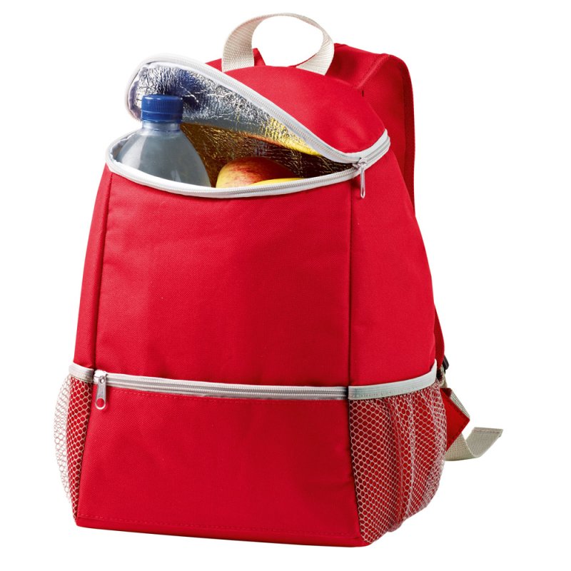 Cooling backpack NOME: 1 large insulated main compartment with zip, 1 front pocket with zip, 2 mesh side pockets, padded shoulder straps, carrying handle
