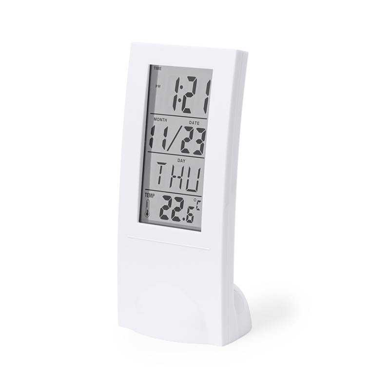 NOVINKA 2025. Weather station made of resistant ABS, with temperature sensor. Time function (12/24), calendar, alarm and day of the week. With base/holder and rear control buttons. Battery powered (2xAAA not included) and presented in an attractive kraft design box. Instruction manual available in English and Spanish.