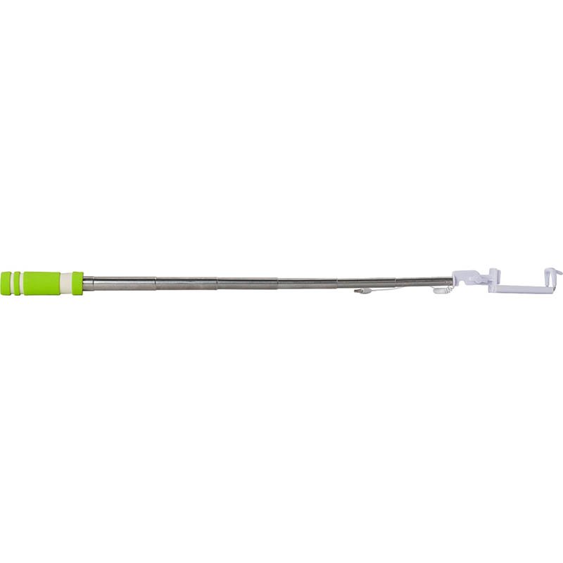 ABS telescopic selfie stick, expandable to a maximum length of 61 cm, with an EVA foam handle. Including a selfie shutter button on the handle and cable with plug, approx. 33 cm long.