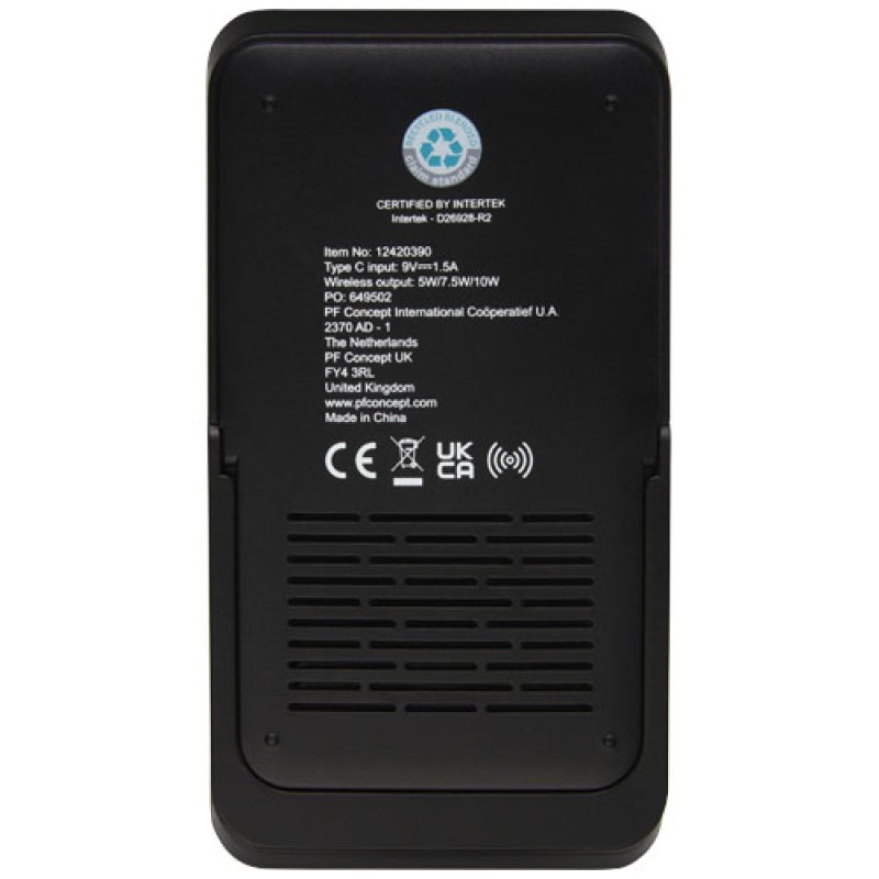 Bezdrátová nabíjecí podložka z recyklovaného ABS plastu. Nabíjecí podložka funguje také jako stojánek na telefon, takže je dokonalým doplňkem ke stolu. Nabíjet začnete tak, že nabíjecí podložku připojíte k počítači nebo notebooku a zařízení na ni položíte. Bezdrátový výkon pro rychlé nabíjení je 10 W (max.). Kompatibilní se všemi zařízeními Qi (iPhone 8 nebo vyšší a zařízení Android, která podporují bezdrátové nabíjení). Dodává se v dárkové krabičce včetně návodu (krabička i návod jsou vyrobené z udržitelných materiálů).