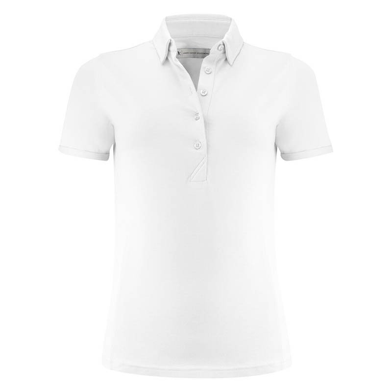 Ladies' polo pique in stretch quality made of organic Fairtrade cotton with elements of elastan for a better fit. Shaped v-neckline, ribbed collar and cuff, straight sleeve and stitch