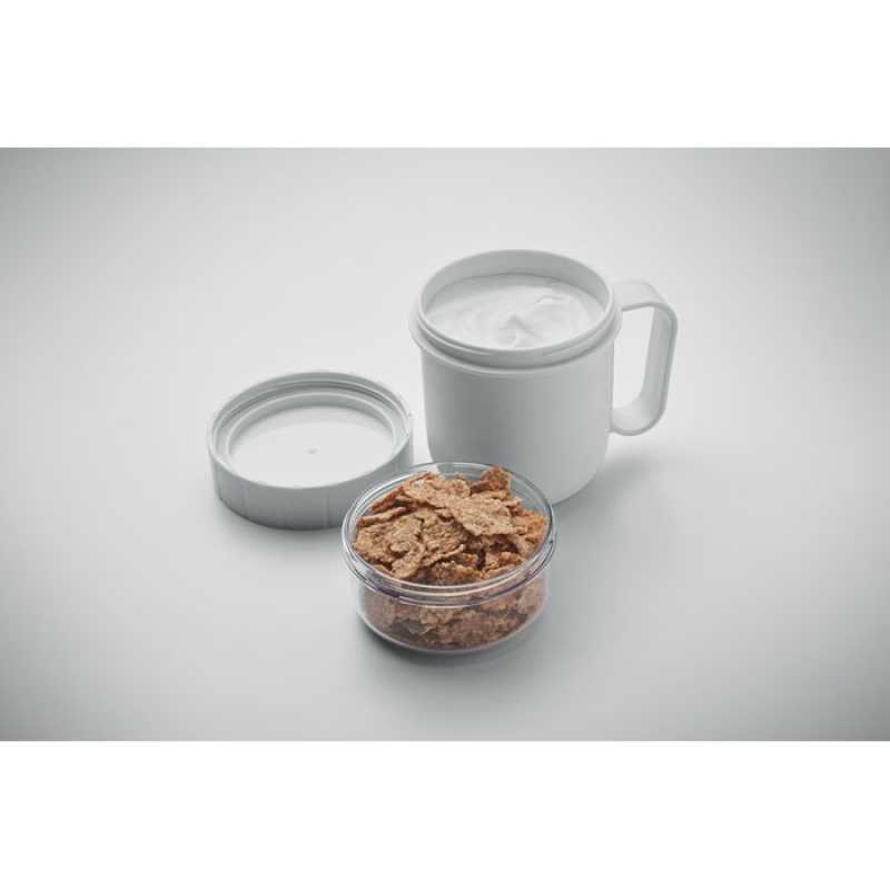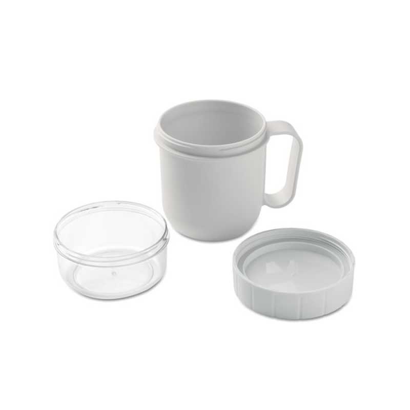 Snídaňový nebo svačinový cestovní kelímek z PP s víčkem z PS. Dvě samostatné nádoby zaručí oddělené ingredience. Objem 450 ml a 160 ml.