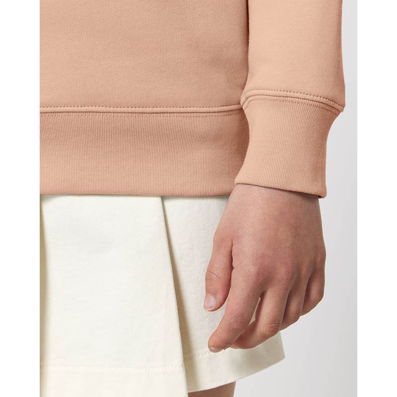 Set-in sleeve 1x1 rib at neck collar, sleeve hem and bottom hem Inside back neck tape in single jersey Self fabric Half moon at back neck with 3 mm twin needle Single needle topstitch at neck collar 2 needle topstitch centered on seam at hem, cuff a
