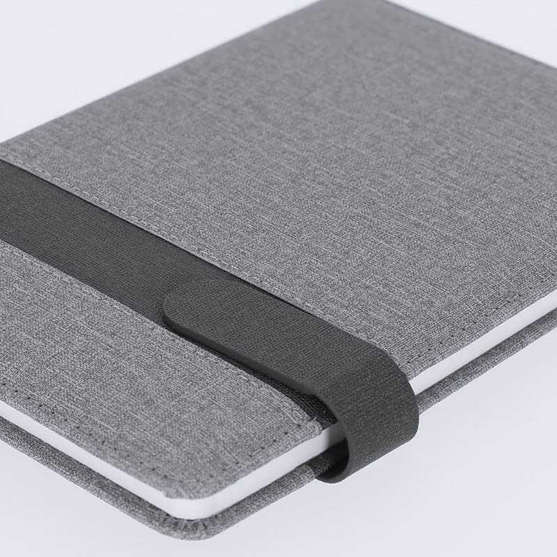NOVINKA 2025. A5 notepad made of PU leather. Stylish grey design with a black magnetic closure band. Inside with 80 sheets in cream colour, with single stripe layout and matching bookmark made of fabric.
