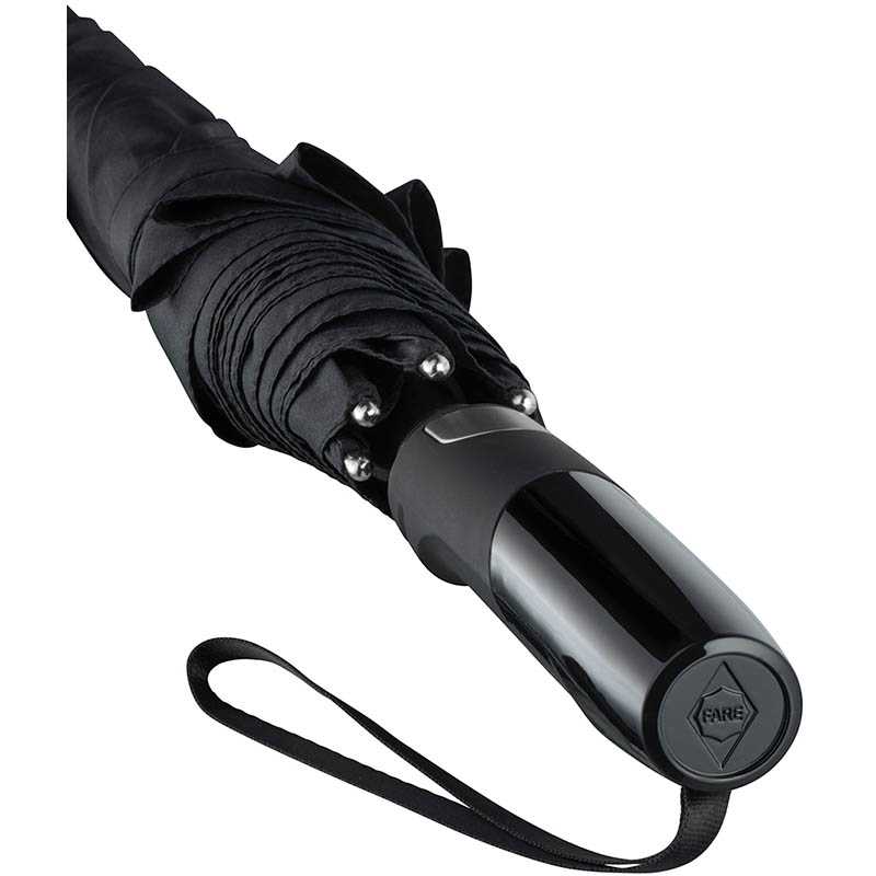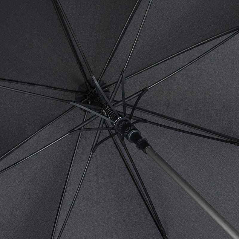 Convenient automatic function for quick opening by pulling down the ring, high-quality Windproof PLUS system for maximum frame flexibility in stormy conditions, flexible fibreglass ribs, polyester pongee material made of recycled plastics, eco-friendly thanks to original waterSAVE® cover material, with waterSAVE® label on the closing strap, silver coloured metal tips, handle high-gloss black with chrome applications and woven carrying loop, closing strap and sleeve with noble push button