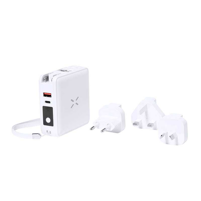 NOVINKA 2025. Wireless, multifunctional and multi-output travel adapter with integrated powerbank of 10,000 mAh charging capacity. Elegant white design with large branding surface. Wireless charging function with magsafe technology, with dual Type C input/output, and USB outputs. Two integrated output cables with Type C and 2-in-1 connectors (Micro USB and Lightning). Simultaneous use for all functions, with wall plug adapters for USA, Europe, Asia, UK and Australia. Presented in an attractive kraft design box. Instruction manual available in English and Spanish.The capacities shown in all our external auxiliary batteries are real, all of them incorporating non-recycled, grade A batteries, with a service life of at least 500 charging cycles, and complying with CE regulations. In addition, they are manufactured according RoHS standards, and in compliance with the following safety requirements: Power bank overcharge protection system. Complete discharge protection system, which increases the durability of the power bank. Blocking system to prevent short circuits. Constant charging transfer system, in accordance with the capacity of the target device.
