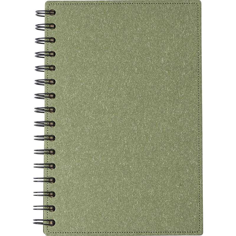 Plstený zápisník z RPET, obsahujúce 160 linajkových strán z recyklovaného papiera so špirálovou väzbou a pútkom na guľôčkové pero.