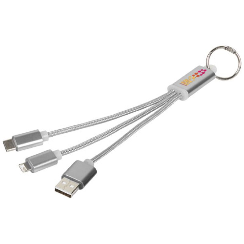 Kovový 3 v 1 nabíjecí kabel s kroužkem na klíče. Kovový 3 v 1 nabíjecí kabel s kroužkm na klíče nabízí 1 typ C, 1 USB typu A a 2 v 1 duální tip kompatibilní s Apple iOS a Android zařízeními. Je dodáván s klíčenkou. Pro nabíjení Apple zařízení použijte kabel se stranou, která nemá žádné piny a pro nabíjení zařízení s Androidem použijte kabel se stranou, která má piny.
