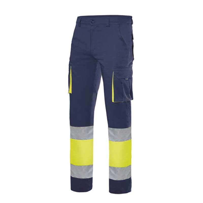 Enhanced Visibility Multi-Pocket Work Trousers. Made of complex bi-stretch fabric that improves user mobility and a water-repellent finish for greater comfort, includes two thermo-fixed elastic reflective tapes on leg cuffs for enhanced visibility and unrestricted movement. Garment certified as an Enhanced Visibility Category II PPE based on 13688 and 17353 standards, type B2 for night visibility.Two slanted hip pockets, two side velcro flap cargo pockets and a two-tone reflective puller for easy opening, two buttonhole closure back pockets for easy access and convenient storage.Double main seams and extra high-wear reinforcements with safety bartacks, ensuring long-lasting strength and durability. Suitable marking methods: embroidery, stitching and anti-sublimation heat-stickers.Ideal as workwear and uniforms.