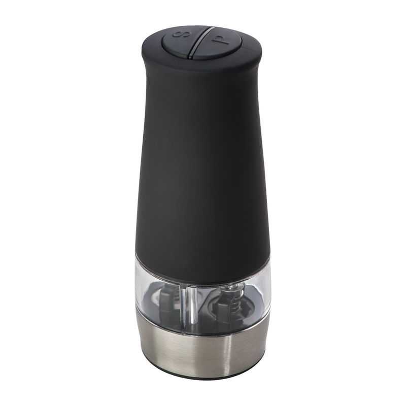 Elektrický mlynček na korenie a soľ, obe polovice môžu byť prevádzkované osobitne, s 2 oddelenými tlačidlami.