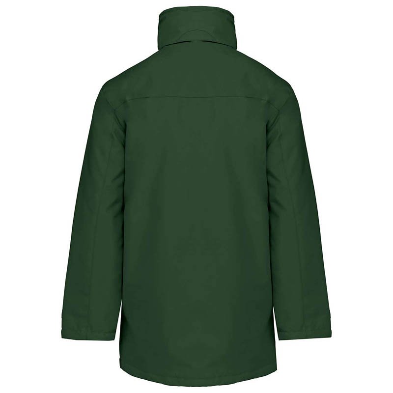 Waterproof Hooded Parka.Made of outer waterproof flat weave, smooth inner lining and inner quilting for ensuring excellent thermal insulation. Thermo-sealed seams that prevent water leaks and hidden hood that can be easily opened and closed by velcro closure and also can be used as a raincoat. Straight-cut waist with adjustable elastic drawstring and stopper, elasticated cuffs for a better fit and added comfort. Two front and two velcro flap chest pockets, an inner zippered left chest pocket for a secure and convenient storage, including a removable transparent badge holder on the left chest. Suitable marking methods: screen printing, embroidery, vinyl application.Ideal as workwear.