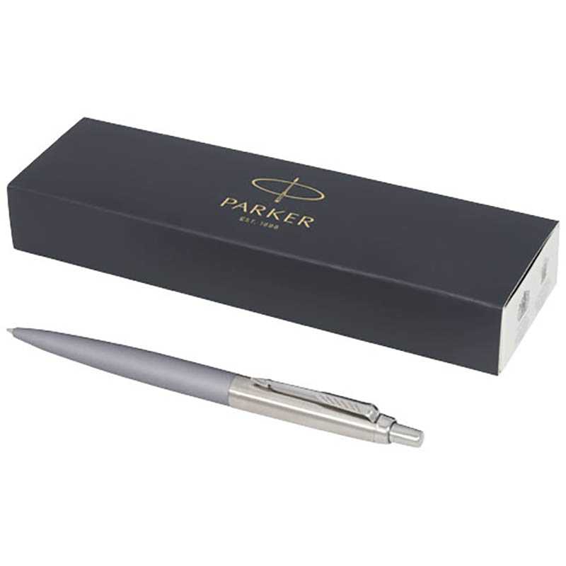 Stainless steel Parker Jotter XL ballpen. Blue ink. The XL Jotter is longer, wider, and heavier than the Original which people with larger hands prefer to write with. Pen pre-packaged in giftbox.