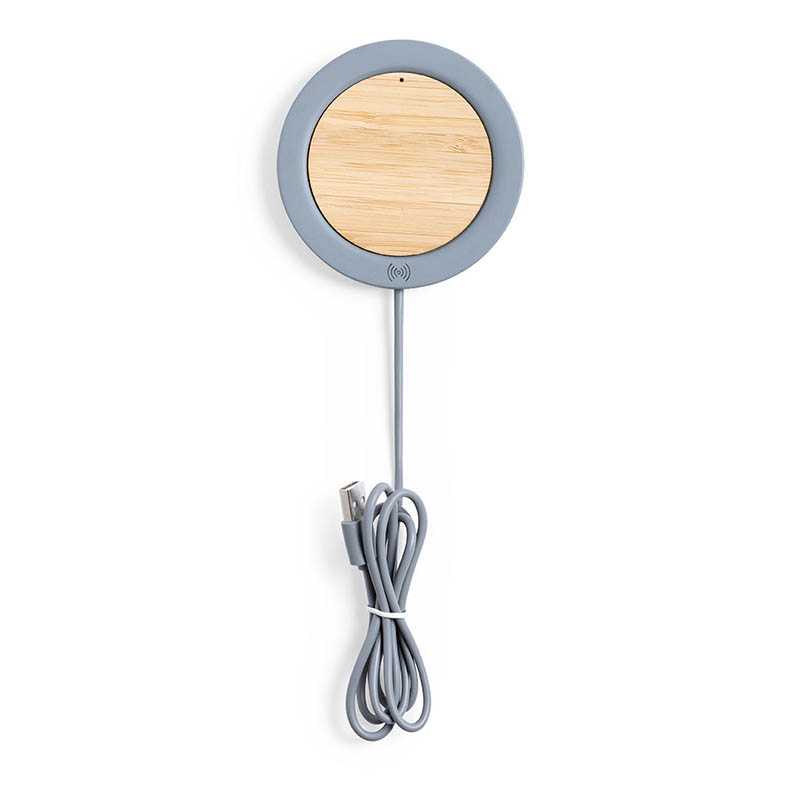 NOVINKA 2025. Wireless charger of round design in combination of natural cut bamboo pieces and limestone cement, a conglomerate formed by the mixture of natural materials, mainly ground limestone and water, obtaining a material of great consistency and durability. USB charging cable in matching color, compatible with devices equipped with wireless charging technology. Safety protection to avoid overheating, overcharging and short-circuiting. Presented in an attractive design box.