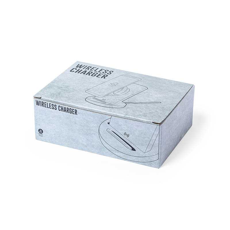 NOVINKA 2025. 5W wireless charger of nature line and circular design, in combination of natural cork and limestone cement, a conglomerate formed by the mixture of natural materials, mainly ground limestone and water, obtaining a material of great consistency and durability. Led indicator and matching USB charging cable, 1m long. Compatible with devices equipped with wireless charging technology. Safety protection to avoid overheating, overloading and short circuit. Presented in attractive eco design box.
