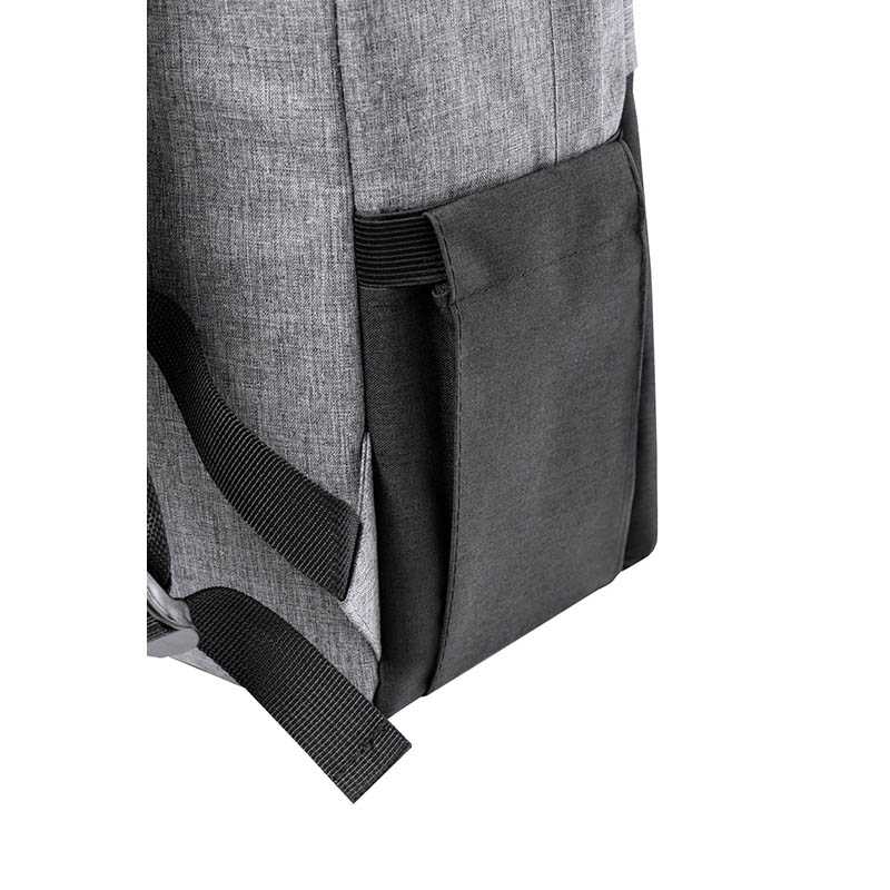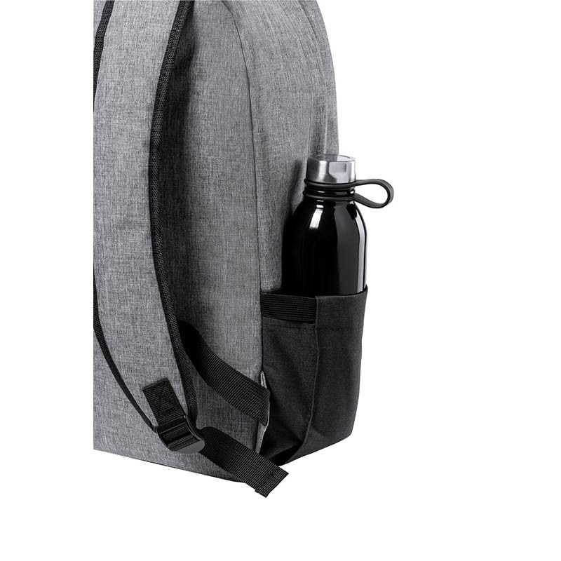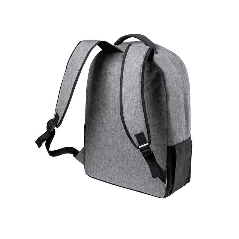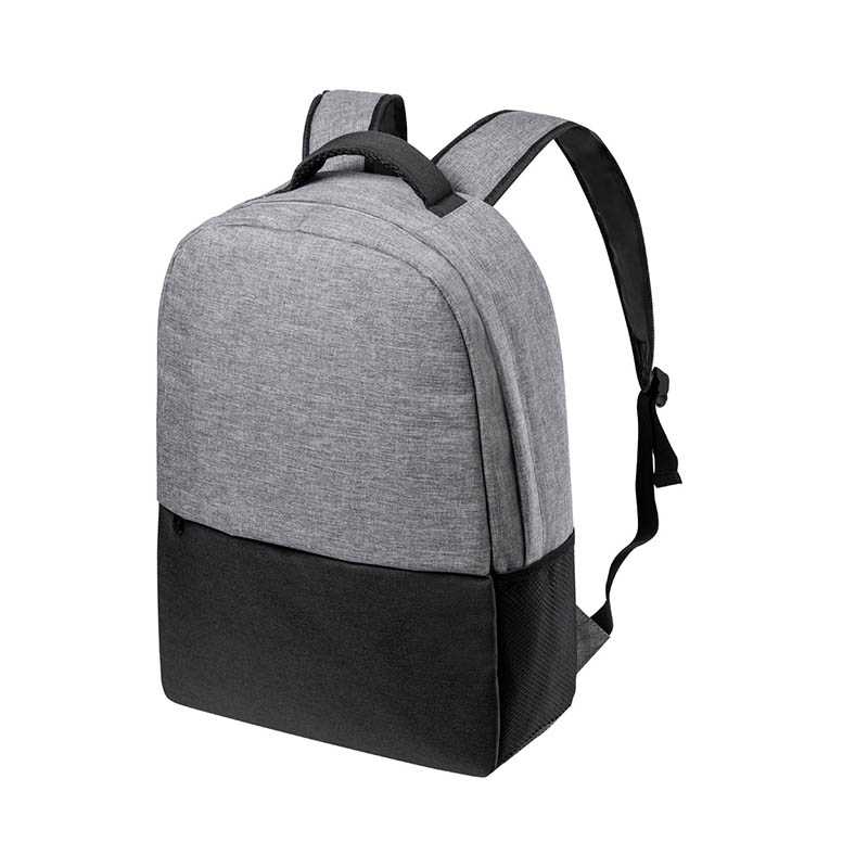 Dvojfarebný ruksak RPET s hlavným priestorom na zips, polstrovanou priehradkou na notebook (15") a tablet (10"), postrannými vreckami, polstrovaným chrbátom a ramennými popruhmi. 600D RPET polyester.