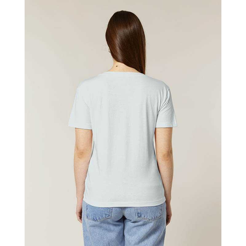 Crewneck T-shirt for women. 2-layered stretch rib in the neck. Oeko-tex certified. • 100% ring-spun, combed and enzyme-washed cotton • 180 g/m2 • 100 white, 120 grey melange (95% cotton, 5% viscose), 121 ash (95% cotton, 5% viscose), 400 red, 484 dusty red, 514 summer blue, 555 faded blue, 600 navy, 784 aloe green, 900 black • XS–XXL