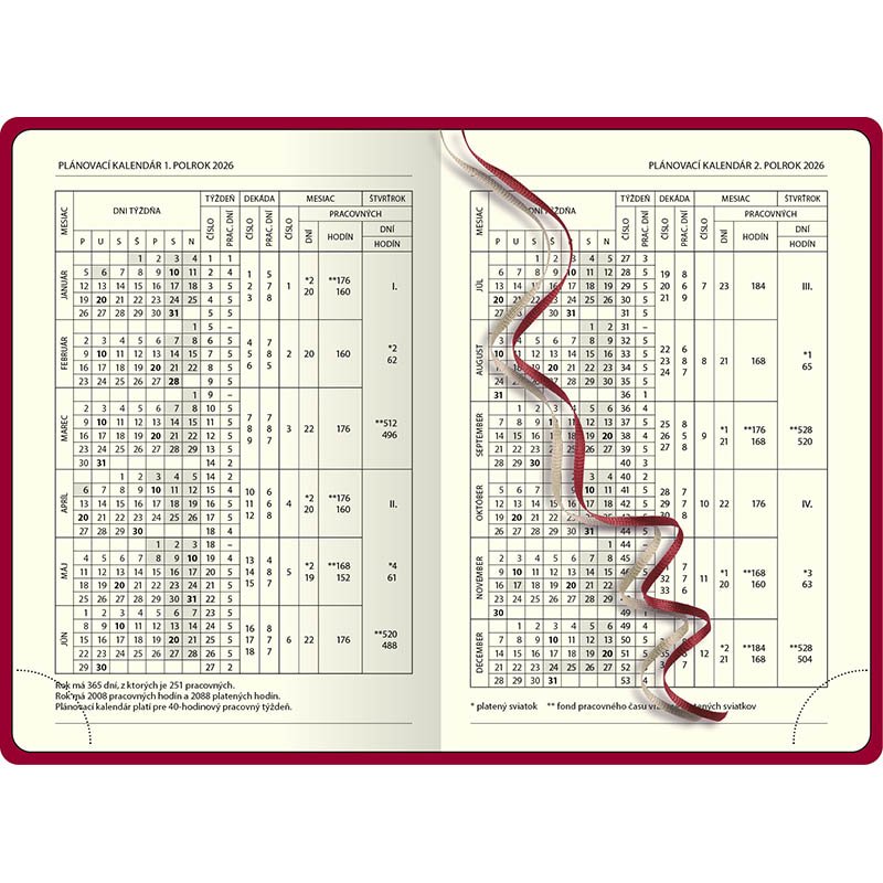 Nová rada diárov v modernom dizajne doplnenom o pevnú gumičku a pútko na pero. Denné rozloženie s česko-slovenským kalendáriom a doplnkovou angličtinou, nemčinou, maďarčinou a ruštinou.• kalendárium od decembra 2025• mesačný plánovací kalendár 2026 • mesačný plánovací kalendár2027• ročný plánovací kalendár 2026–2027 • pracovný plánovací kalendár • sviatky Českej a Slovenskej republiky a medzinárodné sviatky • rozšírený zoznam českých mien • mapa Českej a Slovenskej republiky • miesto pre osobné údaje • textilná záložkaRozsah: 352 strán. Rozmer: 15 x 21 x 3 cm. Hmotnosť: 0,38. Papier: 70 g/m2 krémový papier. Väzba: tuhá knižná s gumičkou a pútkom na ceruzku. Kalendárium: 6 jazyčné (CZ, SK, GB, DE, HU, RU) .