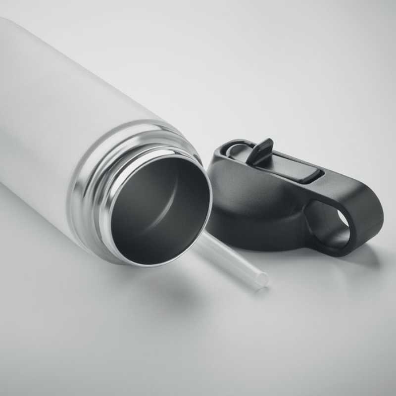 Dvoustěnná láhev z recyklované nerezové oceli (90 % recyklovaná nerezová ocel a 10 % nerezová ocel). Víčko z PP, s úchytem a integrovaným brčkem. Objem: 500 ml.