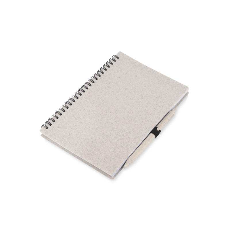 Zápisník TRESA s perem, barevně ladí s přebalem. Propiska a obal sešitu jsou vyrobeny z pšeničné slámy. Spirálový zápisník se 70 čtverečkovými listy z recyklovaného papíru. Formát A5. Modrá náplň do pera.