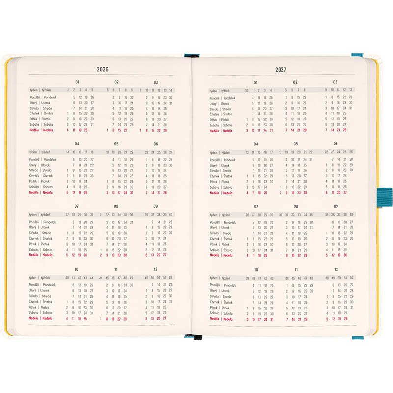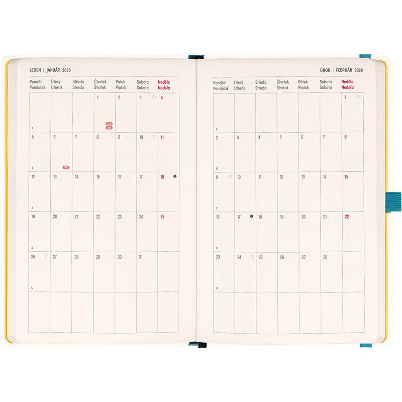 Nový, cenovo dostupný rad diárov s obálkou z ekologického papiera spája štýl a udržateľnosť. Týždenné rozloženie s česko-slovenským kalendáriom a doplnkovou angličtinou, nemčinou, maďarčinou a ruštinou.• kalendárium od decembra 2025• mesačný plánovací kalendár 2026 • mesačný plánovací kalendár 2027• ročný plánovací kalendár 2026–2027 • pracovný plánovací kalendár • sviatky Českej a Slovenskej republiky a zahraničné sviatky• mapa Českej a Slovenskej republiky • miesto pre osobné údaje • textilná záložka • perforované rožky • priestor na poznámkyRozsah: 144 strán. Rozmer: 15 x 21 x 2 cm. Hmotnosť: 0,28. Papier: 90 g/m2 krémový papier. Väzba: tuhá knižná. Kalendárium: 6 jazyčné (CZ, SK, GB, DE, HU, RU) .