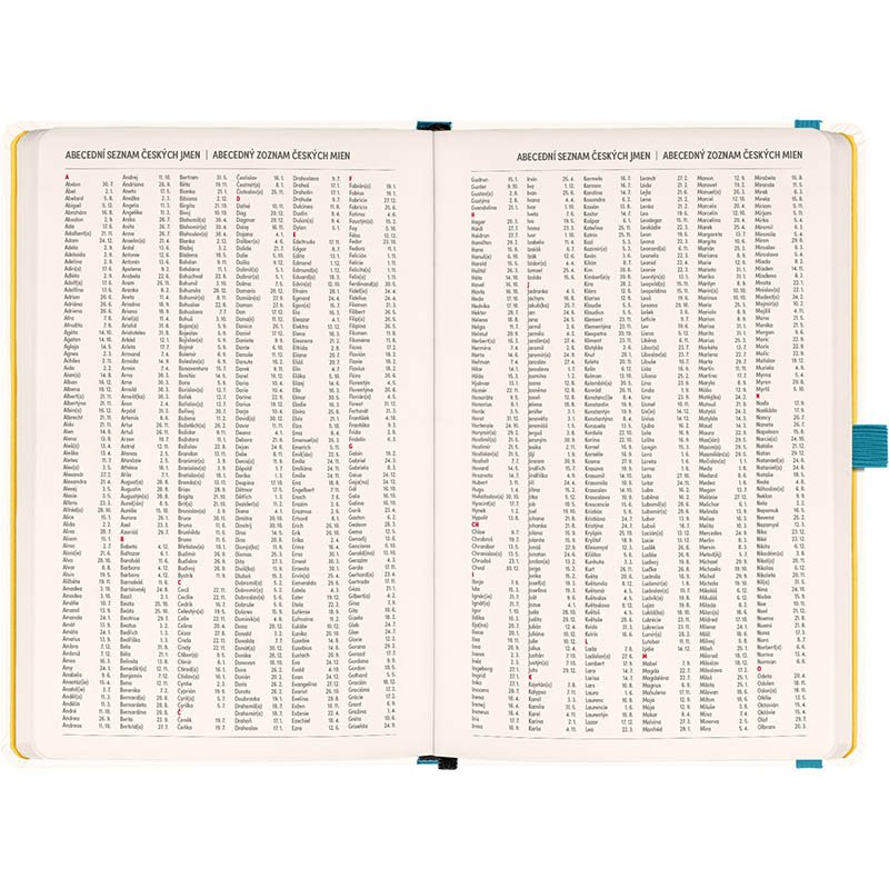 Obsahuje české a slovenské mená. Súčasťou je záložka, pútko na ceruzku a vnútorné vrecko.Dokonalá kombinácia diára a notesu - štrnásťdňová horizontálna kalendárium v ??prvej polovici a linajkované stránky na poznámky v druhej.Rozsah: 144 strán (z toho 72 linajkových). Rozmer: 13 x 21 cm. Hmotnosť: 0,035. Papier: krémový. Väzba: tuhá knižná s uzatváraním na gumičku. Kalendárium: štrnásťdňový CZ/SK.