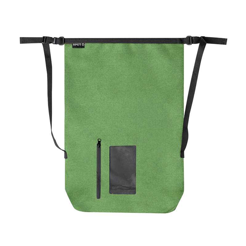 NOVINKA 2025. Large capacity waterproof backpack (25L), made of durable 300D RPET. With security lock, handle with buckle adjustment, carabiner, and adjustable straps. Additionally, it includes a front touch window in transparent PVC. With distinctive RPET label, available in a wide range of colours, and presented in an individual recycled bag. RPET material is made from recycled plastic, thus promoting the reuse of plastic waste and helping the sustainability of the planet.
