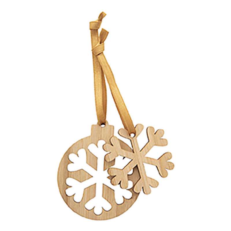 Ozdoby na vianočný stromček 2v1 v bambusovej preglejke so zlatými stužkami. Dodávané s odopnutými stužkami.