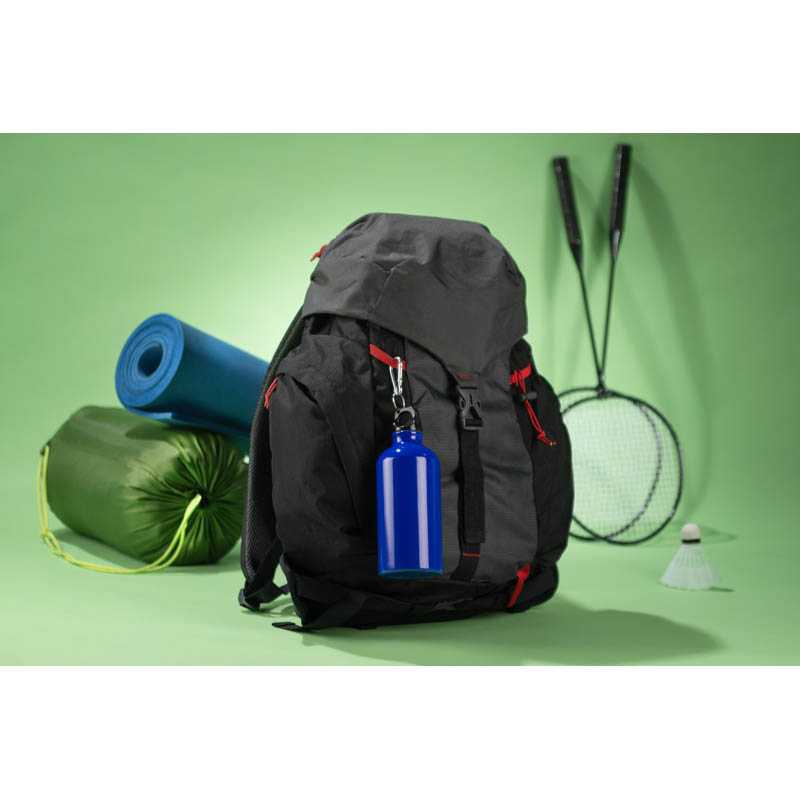 Fľaša z recyklovaného hliníka s objemom 500 ml, s bambusovým vrchnákom a karabínkou.