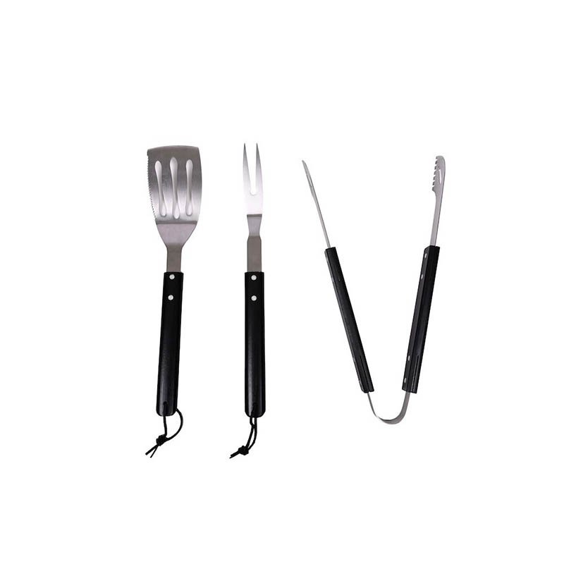 3-piece barbecue set with a spatula, fork and pair or tongs. The handles are in black coloured wood and the set comes in a stylish fabric drawstring bag – the perfect gift for barbecue experts! Fabrics: Stainless steel/wood Weight: 0,56kg Measurement: 47x38x20cm Fork: handle: 20 cm Totally: ca 38cm Tongs: Handle 20 cm Totally: ca 38 cm Fry spade: handle 20 cm Totally: ca 39 cm Packing: Hangtag Do not machine wash