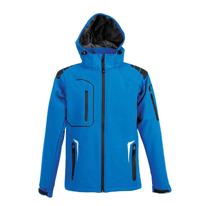 Wind and water repellent softshell jacket. Reversed waterproof zipper at center front and side pockets. Inner pocket with zipper on the left side. Detachable hood. Adjustable velcro closure at bottom sleeves. Hood and seam are adjustable with elastic cords. Hidden embroidery zipper on the inside. Fabrics: Shell: 96% polyester, 4% elastane, 285 g/m2, bonded with 100% polyester birds eye, WP 3000/MVP 3000. Lining: 100% polyester (sleeves) + 100% polyester mesh (body) Size: S-3XL