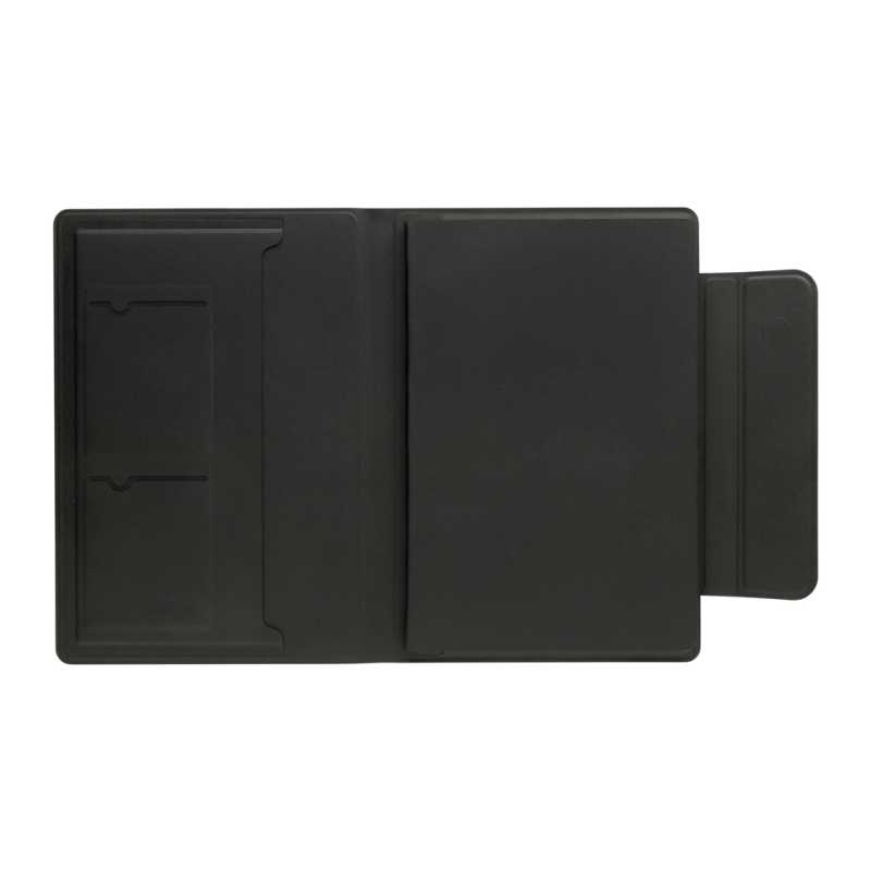 Portfolio A4 z materiálu RPET s detaily z umělé kůže. Vyměnitelný poznámkový blok A4. 30 linkovaných stran z recyklovaného papíru. Držák na tužky. Čtyři přihrádky na karty, tři malé kapsy a jedna velká přihrádka. Uzavírání na magnetický popruh.