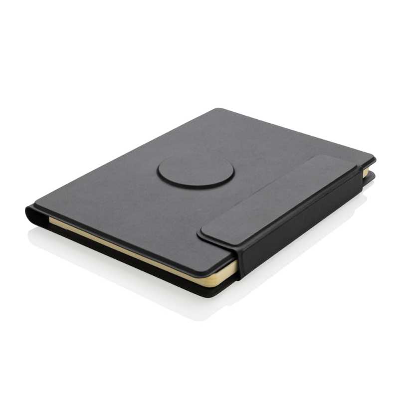 NOVINKA 2025. Portfólio A5, recyklovaný polyester PU s magnetickým zatváraním a magnetickým držiakom na telefón, ktorý je kompatibilný s telefónmi iPhone 12 a vyššími. Uniter papier s linkami, listy sú certifikované FSC® a majú 64 listov/128 strán. Gramáž papiera 80 g/m2, vrecko na dokumenty a 2 sloty na vizitky. Zápisník je znova naplniteľný.