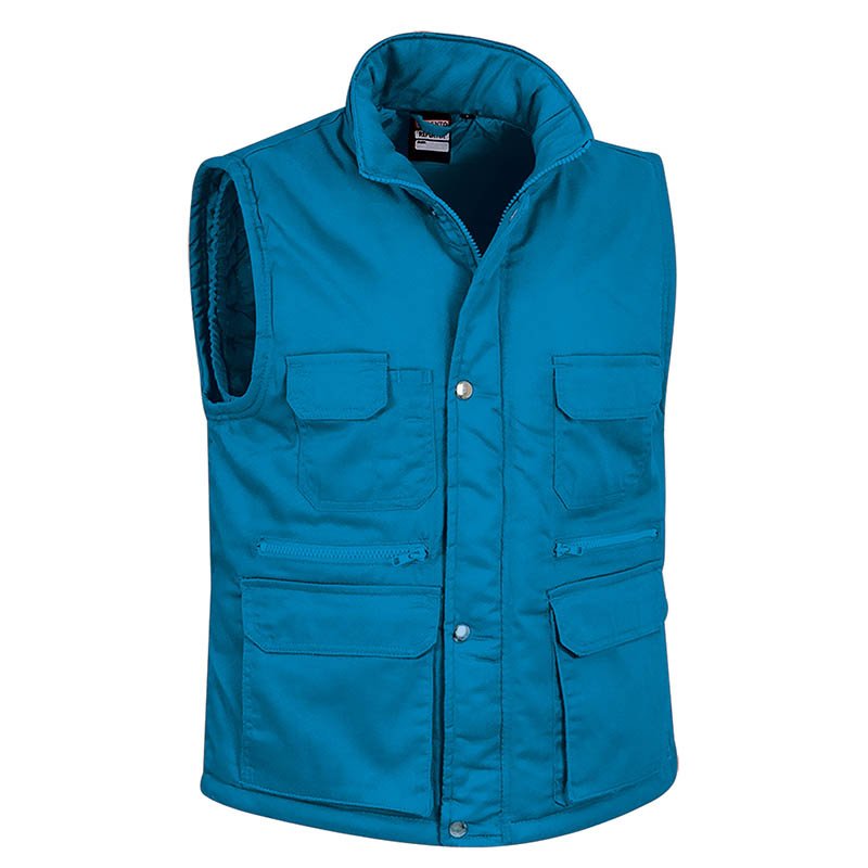 Multi-Pocket Work Vest: Our best-selling vest is a great value for money and comes in a wide range of colours and sizes. Made of a sturdy cotton twill fabric blended with polyester outer fabric for strength and durability, smooth inner lining and inner quilting for ensuring excellent thermal insulation. Stand-up collar with full-zip flap and snap button front closure, which provides warmth and comfort. Elasticated waistband and armholes for a secure and comfortable fit, adjustable waist with side snap button fastening for a better fit, a tailpiece that covers the lumbar zone for added comfort and also provides a large printing area.Two front gusseted pockets, two upper velcro flap pockets, two slanted pockets, two zippered pockets at intermediate height, a pen holder and an inner velcro pocket for a secure and convenient storage. Includes an inside back zip for easy marking with different methods: screen printing, embroidery, transfer printing, badges, shields, vinyl application. Ideal as workwear, uniforms and versatile use.