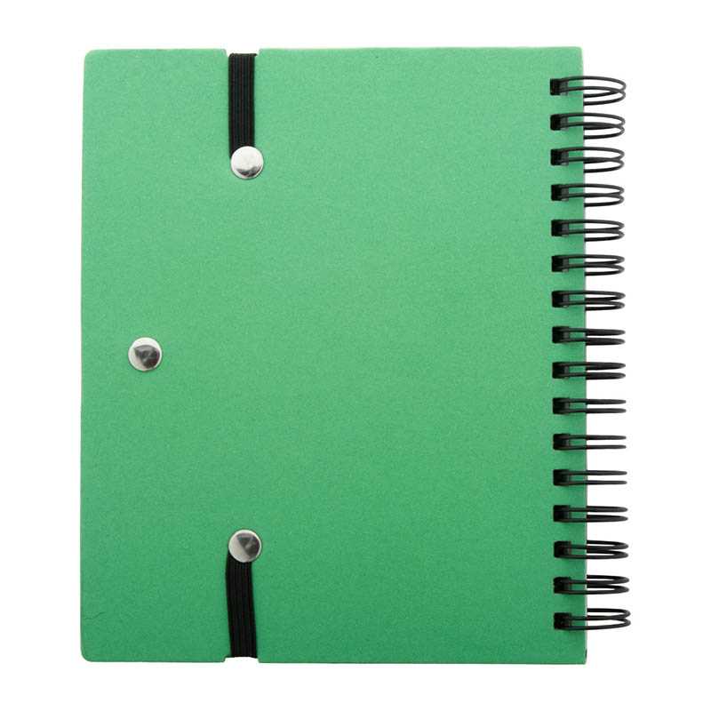 Špirálový blok A6 z recyklovaného papiera so 70 linajkovými listami a 125 popisovačmi stránok (v 5 rôznych farbách). S gumovým pásikom a držiakom na pero. Vrátane guľôčkového pera z recyklovaného papiera s modrou náplňou.
